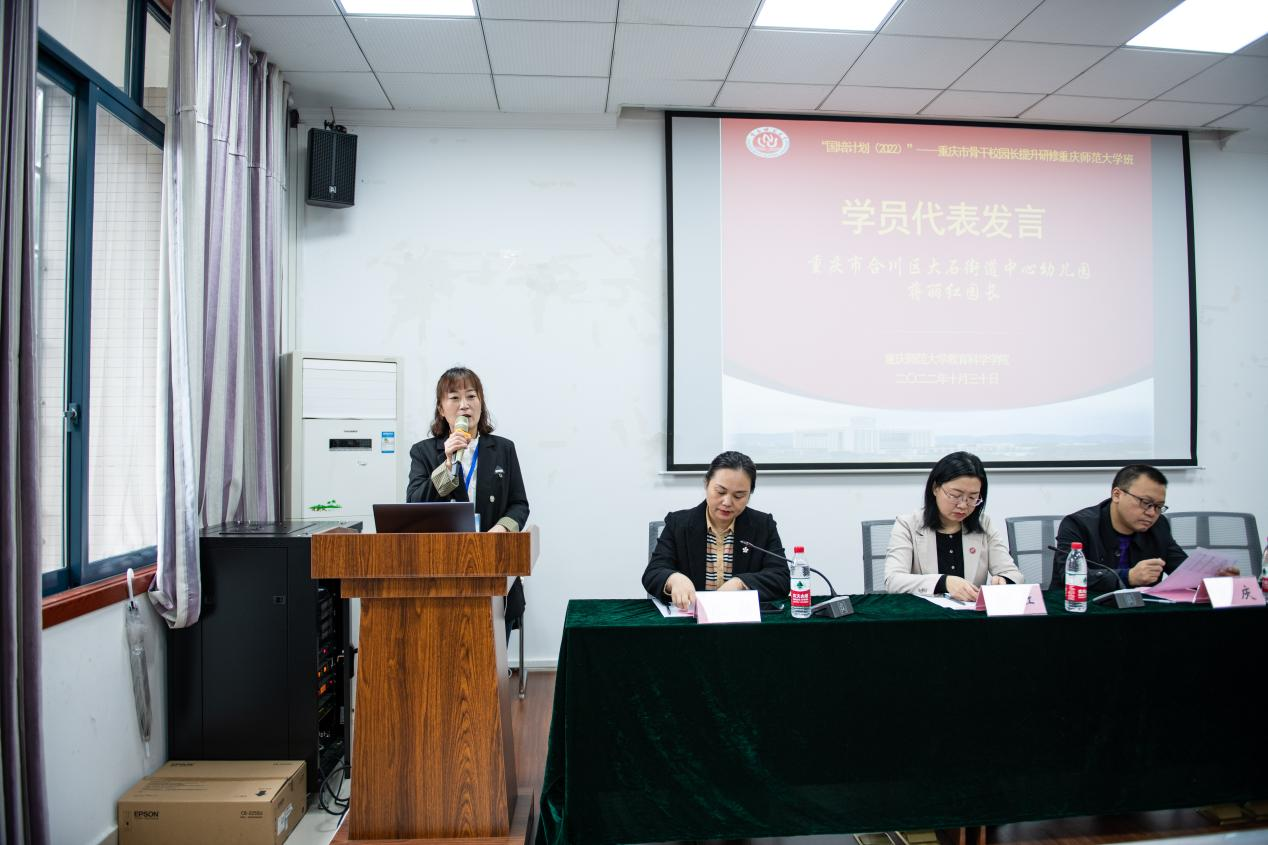 合川区大石中心幼儿园的蒋丽红园长代表全体学员发言,提出要做一位乐知者,在学习中感受聆听教诲的快乐,把握住学习的机会 ,明确学习目标,笃学深思,在培训中提升园长的专业素养和管理水平。面对学前教育新的发展机遇,努力办好人民满意的教育,落实改革发展的新政策,实现幼有所育,学有所教。