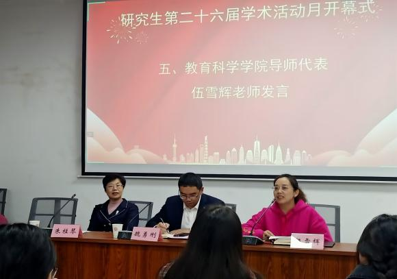 导师代表伍雪辉老师勉励同学们珍惜难得的学习机会,积极参与学术活动月的各项活动,这些活动都汇聚了诸多老师的精心指导,相信同学们能够在本次活动月中有所思、有所获。