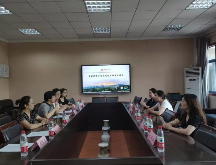 院长助理伍雪辉、渝中区蒙正幼儿园园长陆莹、沙坪坝区桥北幼儿园园长王玲燕、江北新村幼儿园冉春主任、渝中区实验幼儿园周佑君主任、九龙坡石桥铺实验幼儿园代红丽主任、学前教育专业蔡红梅老师、袁秋红老师、余雪老师、刘小红老师就学前教育专业学生的实践能力培养进行研讨。大家一致认为,卓越的实践能力是新时代学前教育专业人才核心素养之一,实践能力测查是学生在毕业之前对实践能力正式、全方位的大检验,目的在于以测促练、持续改进发展,以测提升。