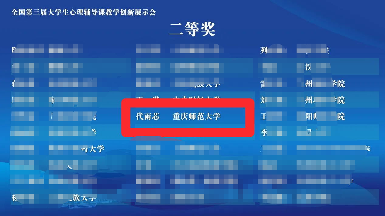 应用心理学2021级本科生代雨芯同学,在洪显利、张潜两位老师的精心指导下,从众多参赛选手中脱颖而出,获得了此次比赛的二等奖。