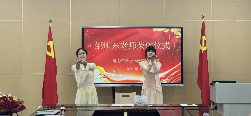 罗书记代表学院颁发荣休证书并献花致敬。张莲、夏山教师领唱《送别》,2022级学生献舞《凤凰花开的路口》,以旋律与舞姿传递桃李情深。多位教师以"善""温暖依靠""育人楷模"等关键词,分享与邹教授共事点滴,勾勒其亦师亦友的立体形象。