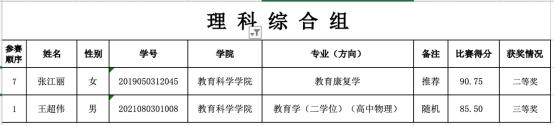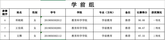 第十二届本科师范生教学技能创新大赛自3月正式启动以来,经过院级初赛、校级决赛两轮角逐,现已圆满闭幕。经过来自中小学一线的43位评审专家通过线上云平台对选手们的教案、课件、演讲和模拟授课视频进行综合评审,19级教育学唐钰颖同学获得文科组一等奖、19 级邓朝莉同学获得学前组一等奖。19 级教育康复专业张江丽同学获得理科组二等奖、王佳琪同学获得学前组二等奖。20级教育学二学位王超伟同学获三等奖、文雅获学前组三等奖。