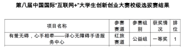 自学校于4 月正式启动第八届中国国际“互联网 +”大学生创新创业大赛校级选拔赛工作以来,经学院初赛、校级网评赛、复赛、排位赛等流程,学院《有爱无碍,心手相牵——译心无障碍手语服务中心》项目以排名第一的成绩喜获一等奖。