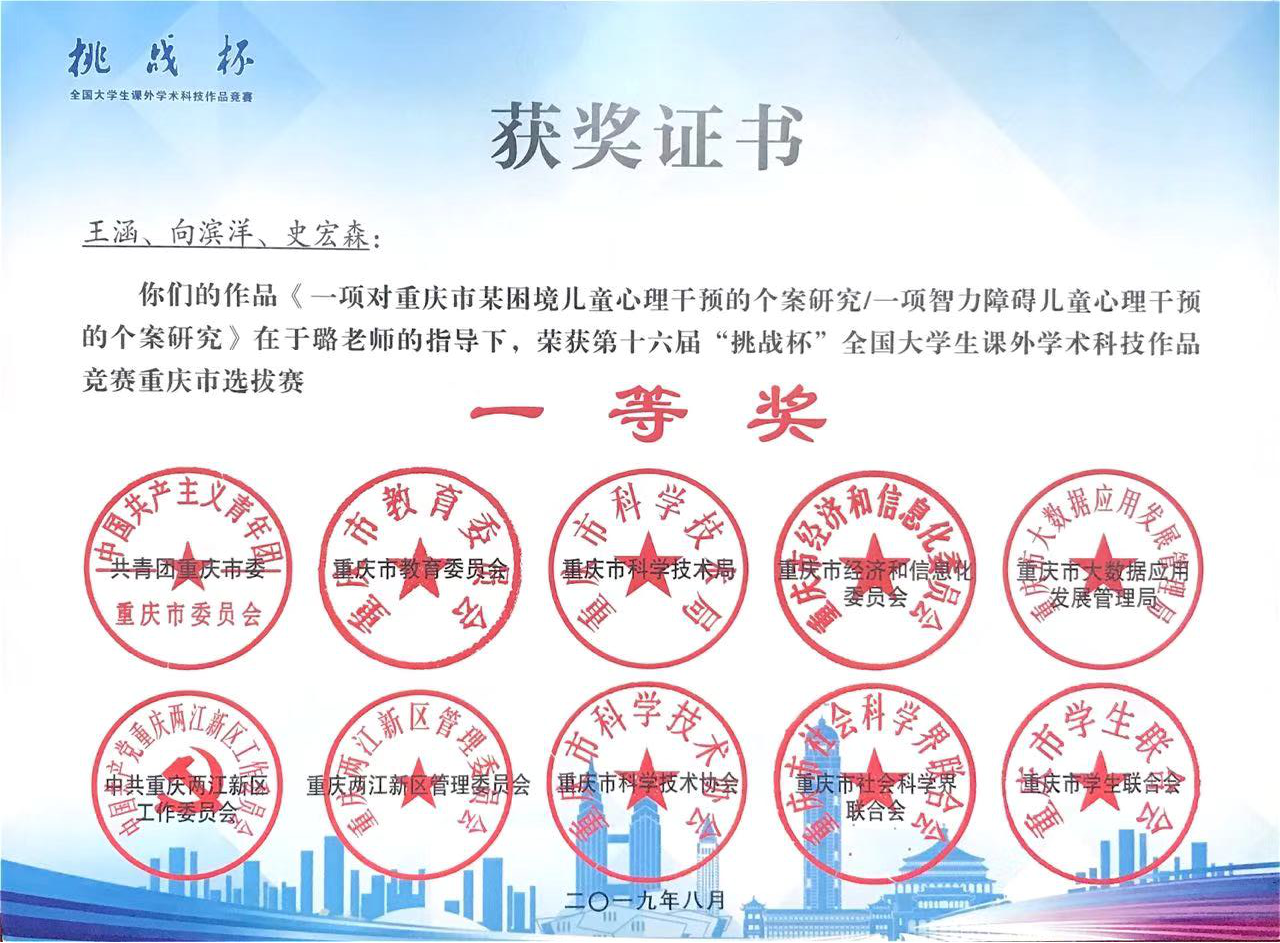 研究生汪涵、向滨洋、史宏森同学的作品《一项对重庆市某困境儿童心理干预的个案研究》获得一等奖,成绩喜人。