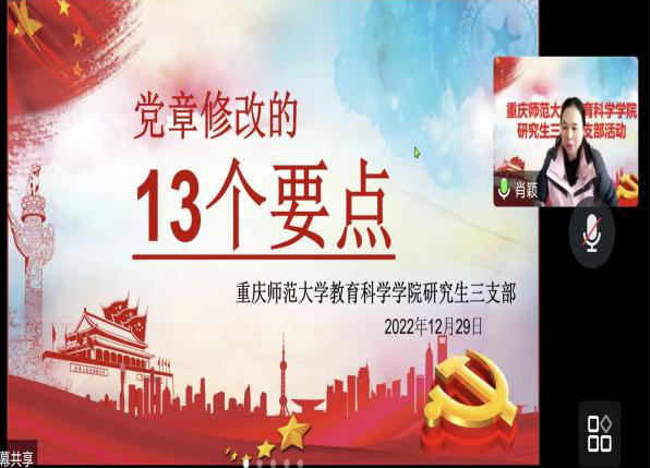 为了进一步学习党的先进思想,提升党员理论修养,加强党支部建设,党支部书记肖颖带领支部成员一起学习党章修改的13个要点。我们要深刻把握党章改、变与不改、不变的规律,把党章的明文规定和贯穿党章始终的原则、精神学深悟透,使之真正成为党员加强党性修养的根本标准,成为指导党的工作、党内活动、党的建设的根本依据。
