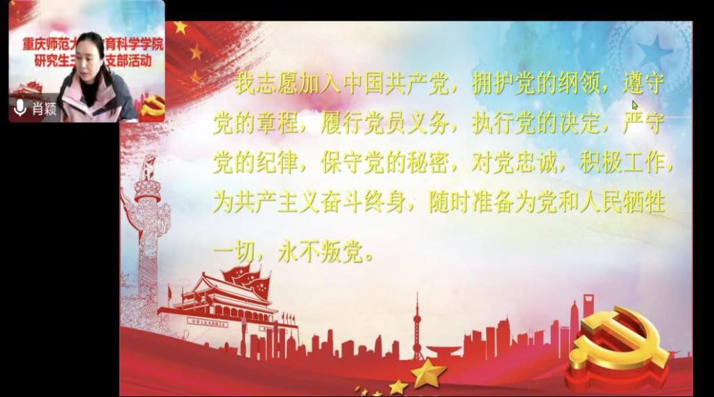 本系支部活动首先对罗诗敏、陆小辉、陈萌、艾先润四位同志严格按照组织发展程序进行了发展。党支部书记肖颖宣读了支部决议,并对四位同志提出了要求与期望,四位同志表态承诺在今后的学习和工作中将更加严格要求自己,努力提升自己,用实际行动终生践行入党誓词。