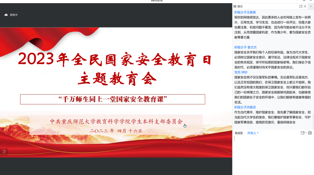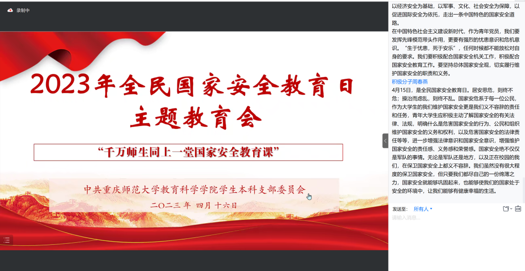 学生本科支部于2023年4月16日开展2023年全民国家安全教育日主题党日活动,全体党员和积极分子参加。
