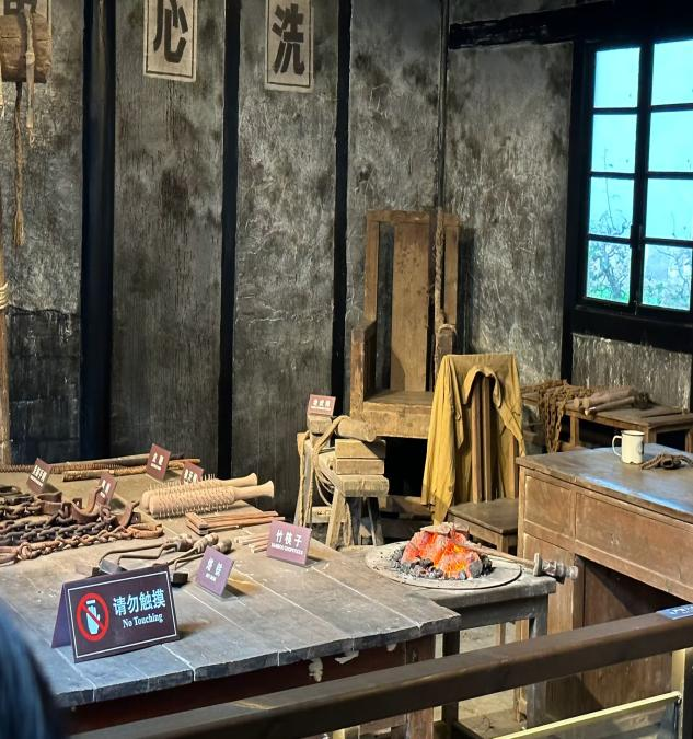 在刑讯室外,可以清楚地看到当年审讯江姐等革命者使用的刑具:手铐、脚镣、皮鞭、烙铁、竹签、老虎凳等,令人毛骨悚然,国民党反动派对共产党人的残酷折磨,实在让人痛恨和愤怒。
