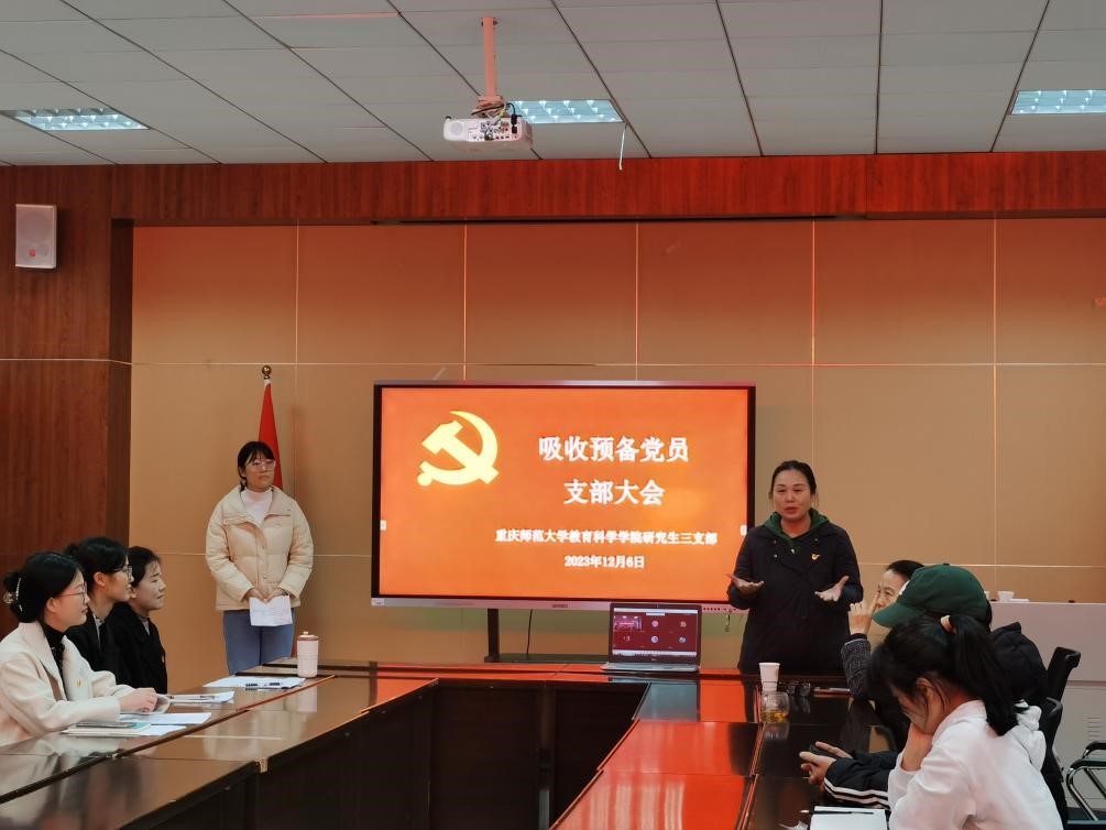 研究生三支部于特教楼2421召开吸收预备党员支部大会。本次大会的主要内容为讨论元振丽、傅红理、黄嘉欣3名同志是否发展为中共预备党员的问题。bl漫画