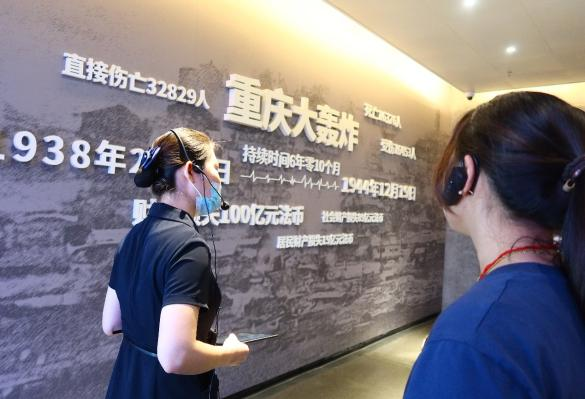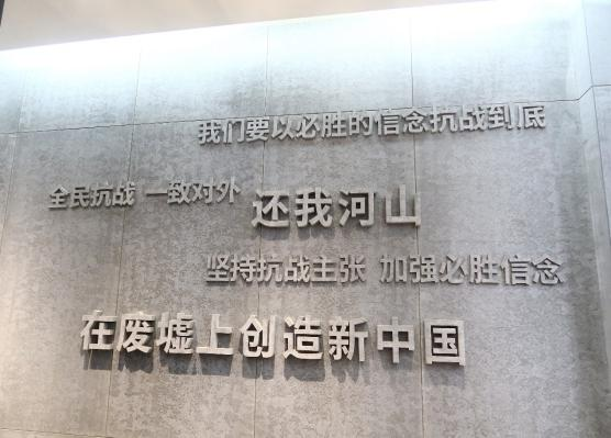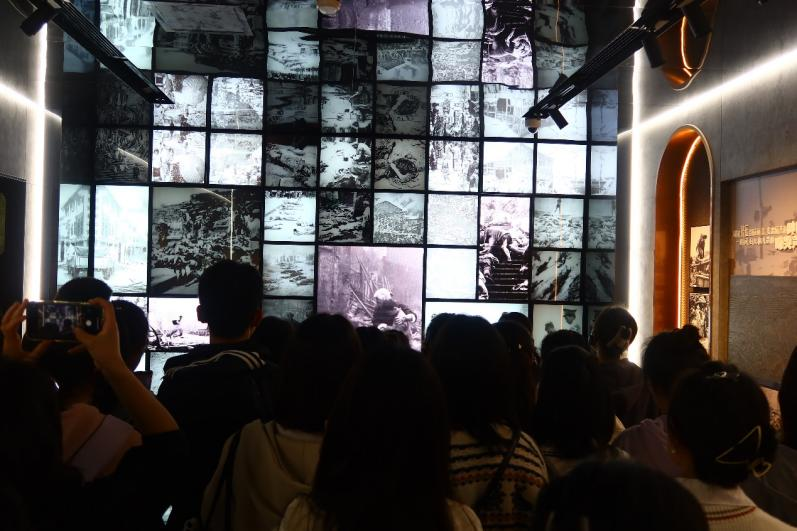 出隧道过后我们来到了一面墙前,墙上随机播放着重庆大轰炸的纪录片,我们看到了轰炸进行时无助的老人和孩子,横七竖八的倒在阶梯上的尸体,一幕幕,一帧帧,让人百感交集,泛红了眼眶,更加坚定和明确了我们的责任和使命。