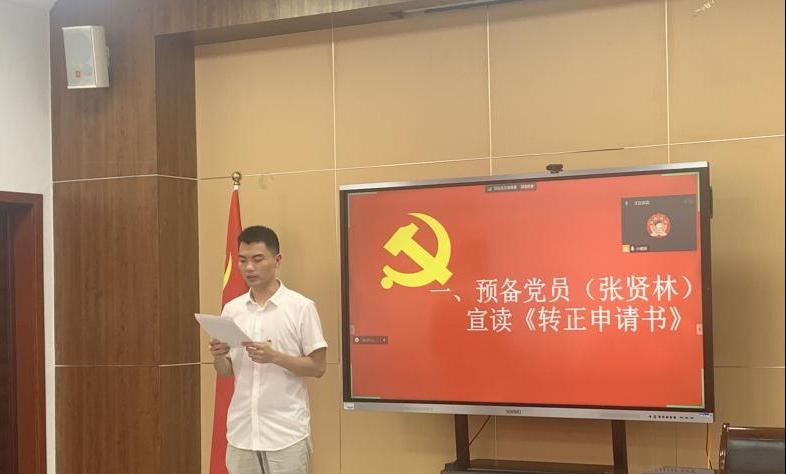 张贤林同志汇报个人在预备党员期间的工作、学习情况,正式向党支部提出转正申请。张贤林同志客观了评价自身情况,认识到要进一步加强党性修养,表示会坚持学习中国特色社会主义理论体系,继续深入学习习近平新时代中国特色社会主义思想。他将会在今后的工作与学习中,继续坚持以优秀党员标准要求自己。支部书记肖颖同志对张贤林同志在考察期的思想、学习和工作等各方面的表现给予充分的肯定,对其加入党组织表示祝贺,希望张显林同志不忘初心,为党的事业发展贡献自己的力量。