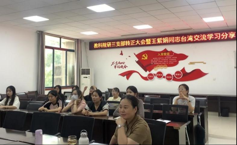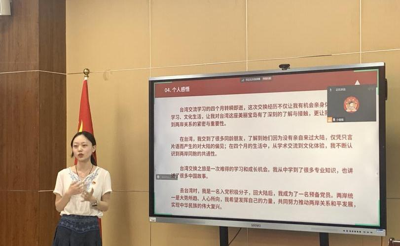 王紫娟同志对自己在台湾交换学习一学期的情况进行汇报。她详细介绍了台湾东部的文化以及台湾特殊教育事业的发展情况,王紫娟同志表示在台湾的一学期收获颇多,同时也认识到两岸同胞刻在血脉里的共通性,两岸统一是大势所趋、人心所向。
